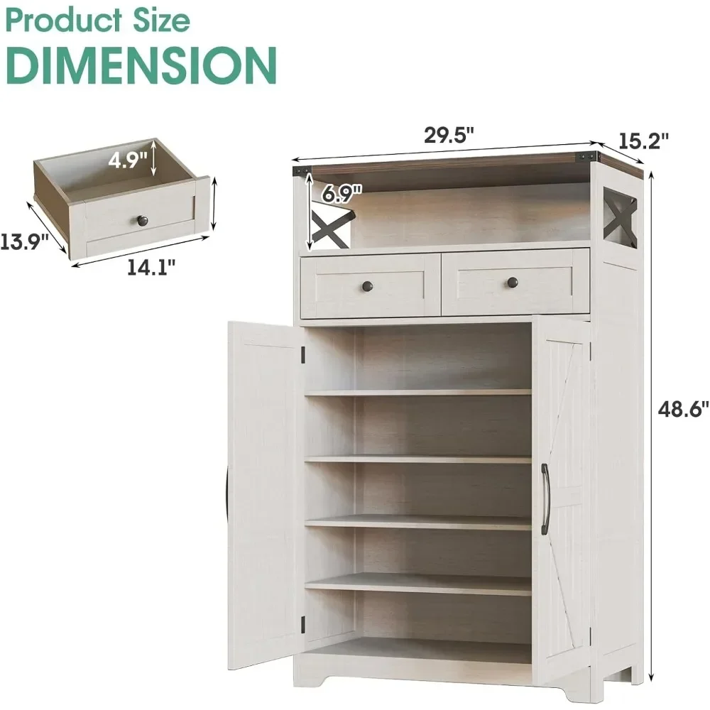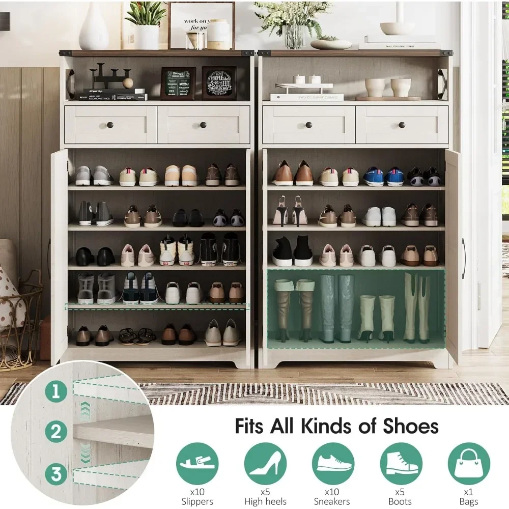 Bring warmth and organization to your home with this farmhouse style shoe cabinet designed to blend rustic charm with modern functionality. Crafted with a sturdy frame and clean-lined silhouette, it features two smooth-glide drawers for storing keys, accessories, or small essentials, while the enclosed cabinet doors keep shoes neatly hidden from view. Adjustable interior shelves allow you to customize storage for sneakers, boots, or flats, making it ideal for entryways, living rooms, or hallways. The wood-inspired finish adds a cozy, modern rustic touch that complements a wide range of décor styles. Built for everyday use, this cabinet helps reduce clutter while enhancing your space with practical storage and timeless farmhouse appeal.