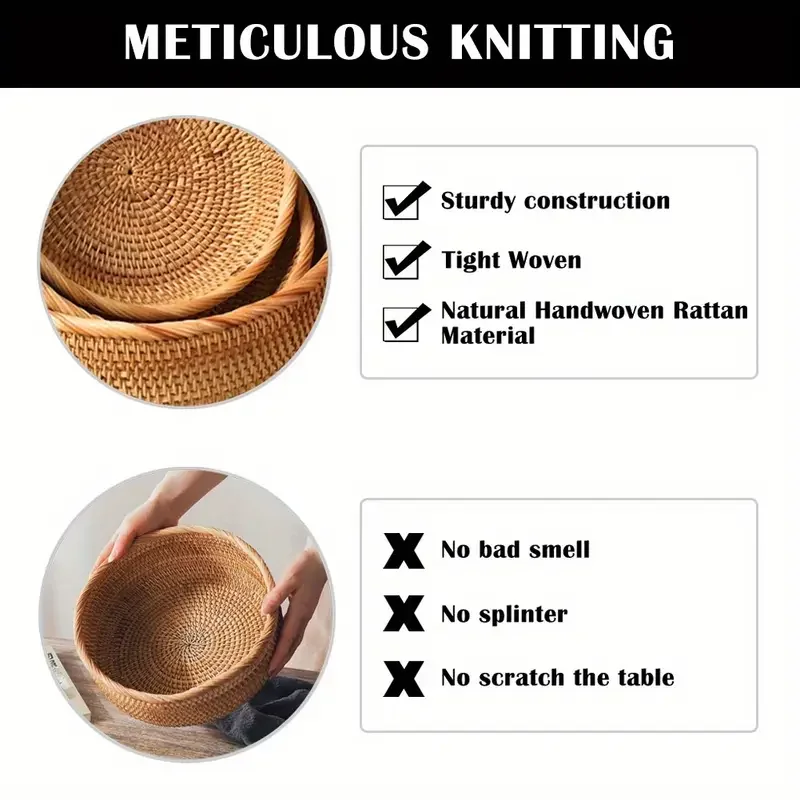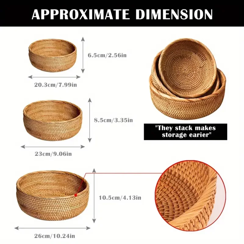 Organize your home with style using this hand-woven rattan wicker storage basket. Crafted from natural rattan, this versatile basket is perfect for storing fruits, snacks, bread, tea, cosmetics, or small household items. Its sturdy construction ensures durability while maintaining a lightweight feel, making it easy to move and use anywhere—from the kitchen and dining table to the bathroom or desktop. The natural texture and warm tones of the handwoven rattan add a rustic, cozy touch to any space, blending seamlessly with farmhouse, boho, or modern decor styles. Ideal for both functional storage and decorative display, this basket keeps your essentials neatly organized while enhancing your home’s aesthetic. Each basket is handwoven, making every piece unique with subtle artisanal variations that showcase craftsmanship. Perfect for daily organization, serving, or gifting, this storage basket combines practicality with natural beauty. Bring charm, order, and convenience to your household with this stylish rattan wicker basket—a simple yet elegant solution for storage, display, and organization.
