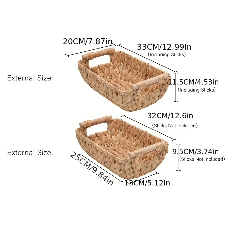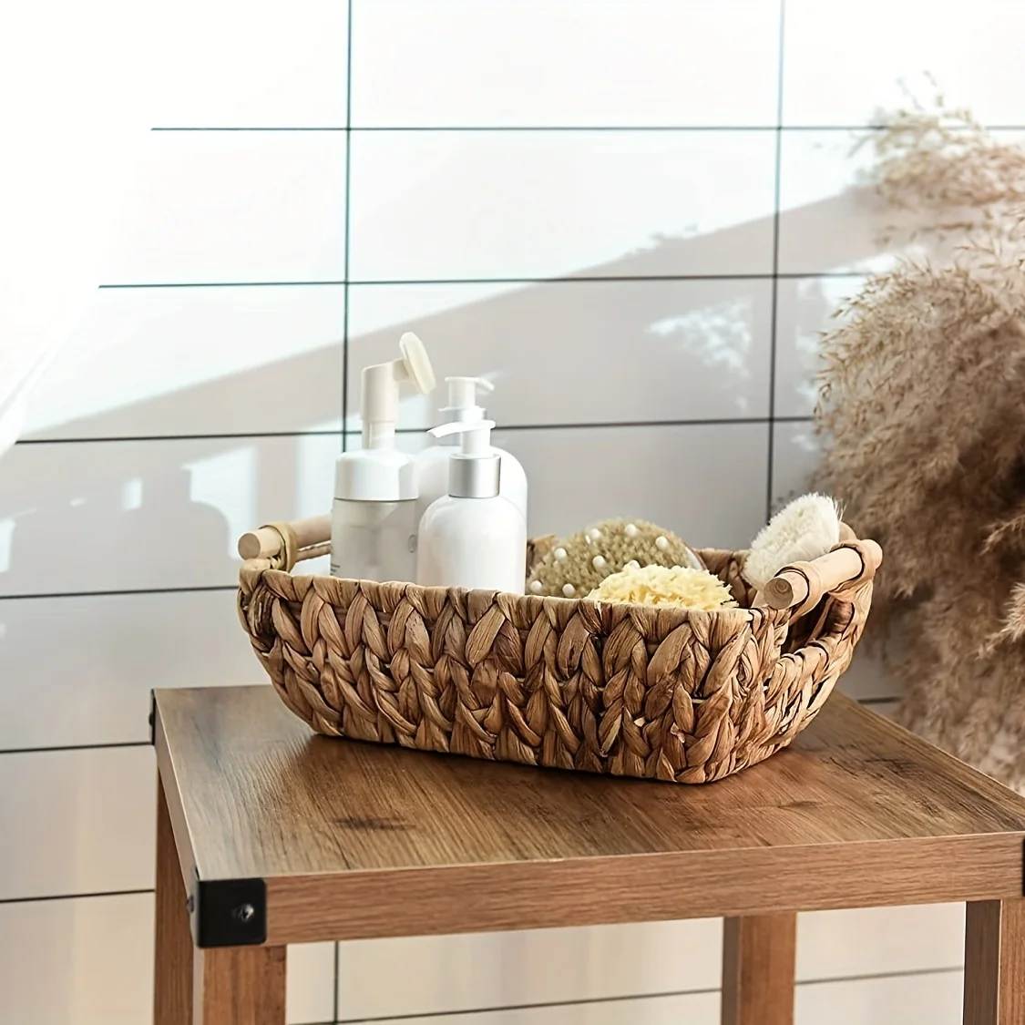 Elevate your home organization with this charming hand-woven wicker basket. Crafted from natural water hyacinth and featuring a sturdy wooden handle, this basket combines practicality with rustic elegance. Its lightweight yet durable construction makes it perfect for storing bathroom essentials, small household items, or even as a decorative display piece. The natural texture and warm tones of the handwoven design bring a cozy, organic touch to any space, complementing a variety of decor styles from farmhouse to boho chic. Ideal for keeping towels, toiletries, magazines, or crafts neatly organized, it adds both style and function to your home. Each basket is carefully handwoven, making every piece unique with slight variations that reflect artisanal craftsmanship. Use it on shelves, countertops, or in cabinets to create an organized and visually appealing environment. Whether for storage, decor, or gifting, this versatile wicker basket offers a perfect blend of charm, utility, and sustainable design, bringing both beauty and order to your living space.