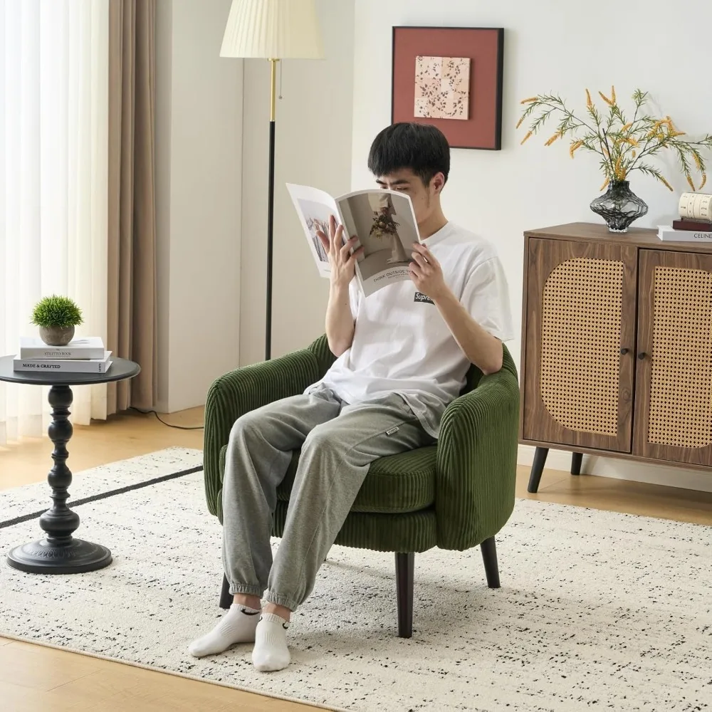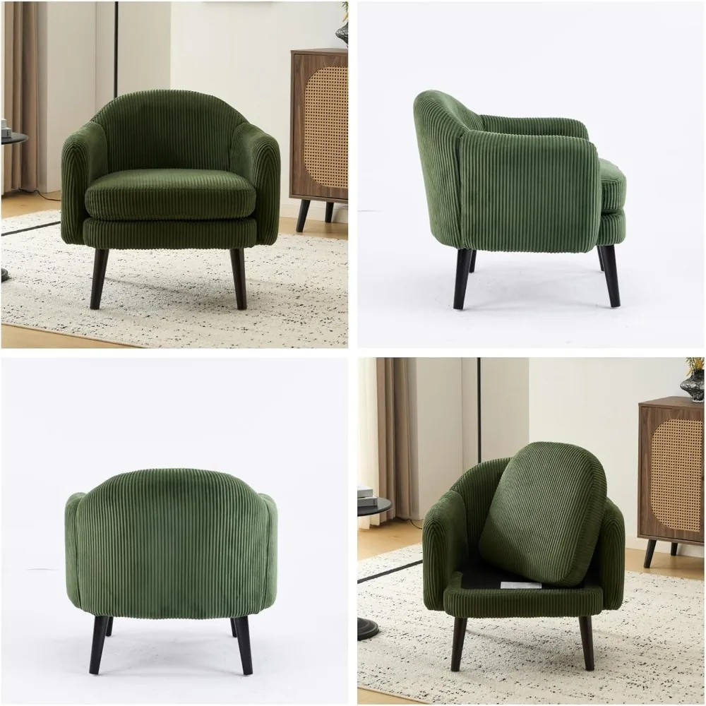 This set of two modern barrel accent chairs features track armrests, comfy upholstered seats, and solid wooden legs. Stylish, durable seating perfect for customized living spaces.