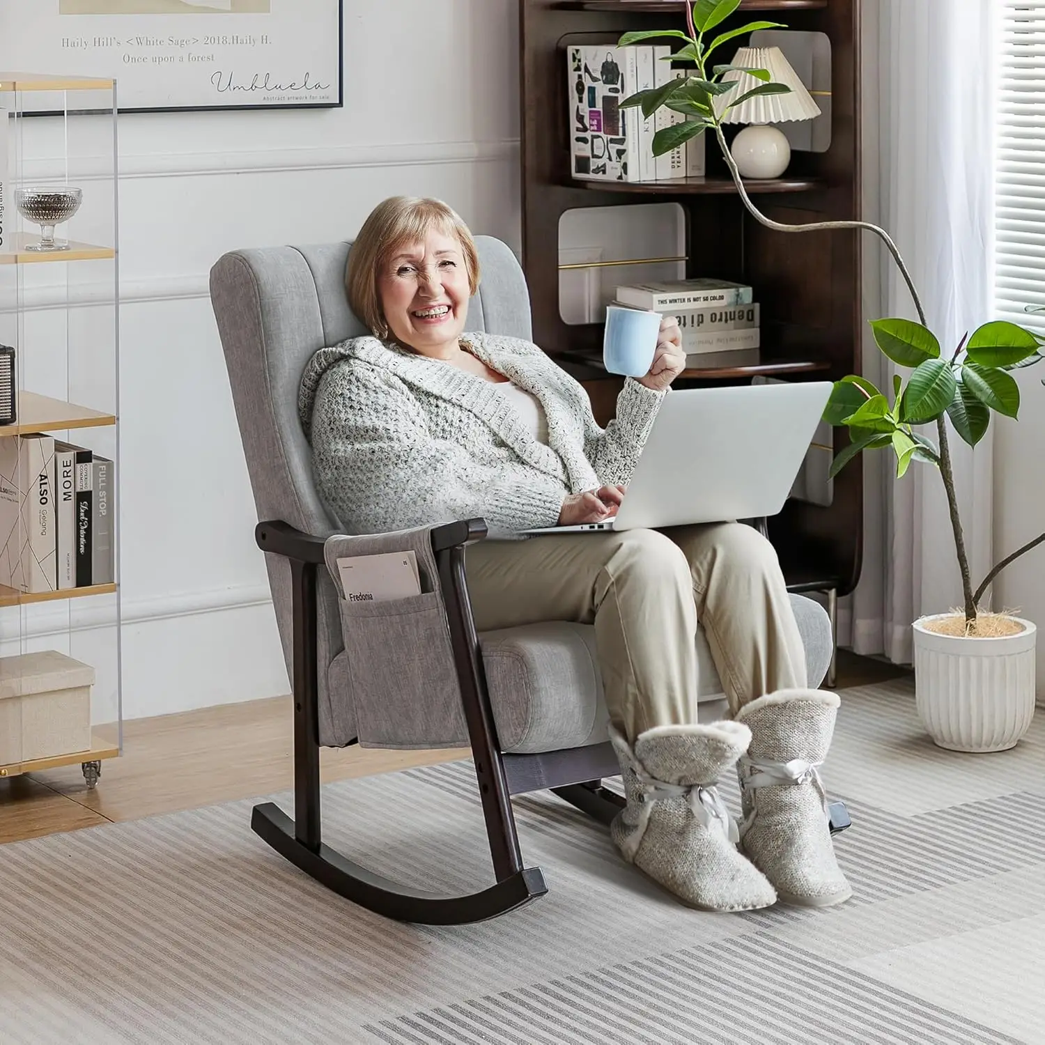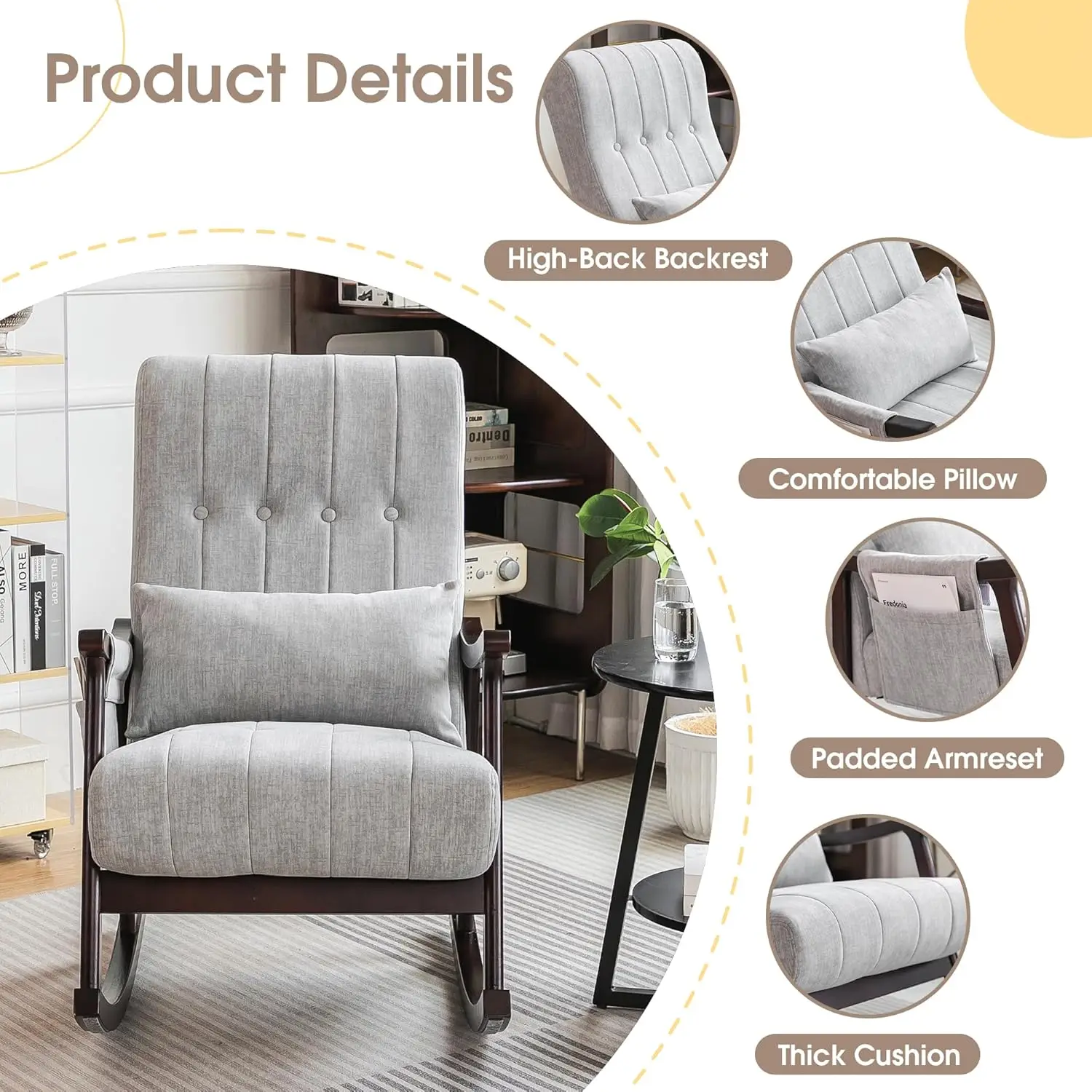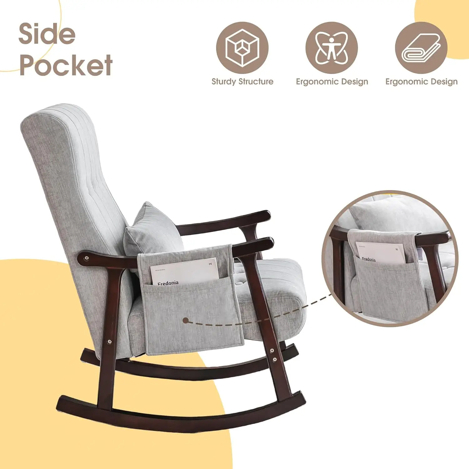 This modern nursery rocking chair provides soothing comfort for daily relaxation. The gentle gliding motion is perfect for calming babies or unwinding after a long day. Its high-back design offers excellent support for the shoulders and upper body. The padded seat adds plush comfort for extended sitting. A matching pillow enhances support and completes the cozy look. The side pocket provides a convenient place to store essentials. The soft grey color blends beautifully with nursery and living room décor. Its sturdy frame ensures stability and long-lasting use. The chair is designed for both comfort and modern style. This glider creates a peaceful and inviting spot for bonding, reading, or relaxing.