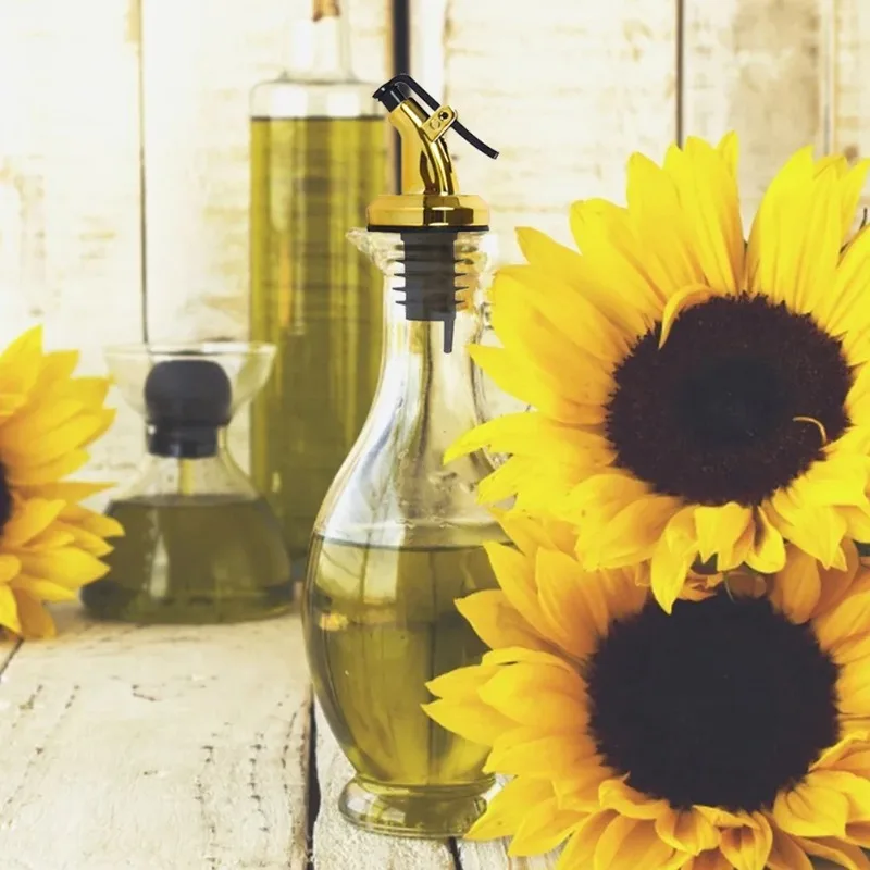 Set of 2 press-type oil bottle stoppers with sealed, leakproof design. Easy-pour nozzle controls oil and soy sauce flow for cleaner, mess-free cooking.
