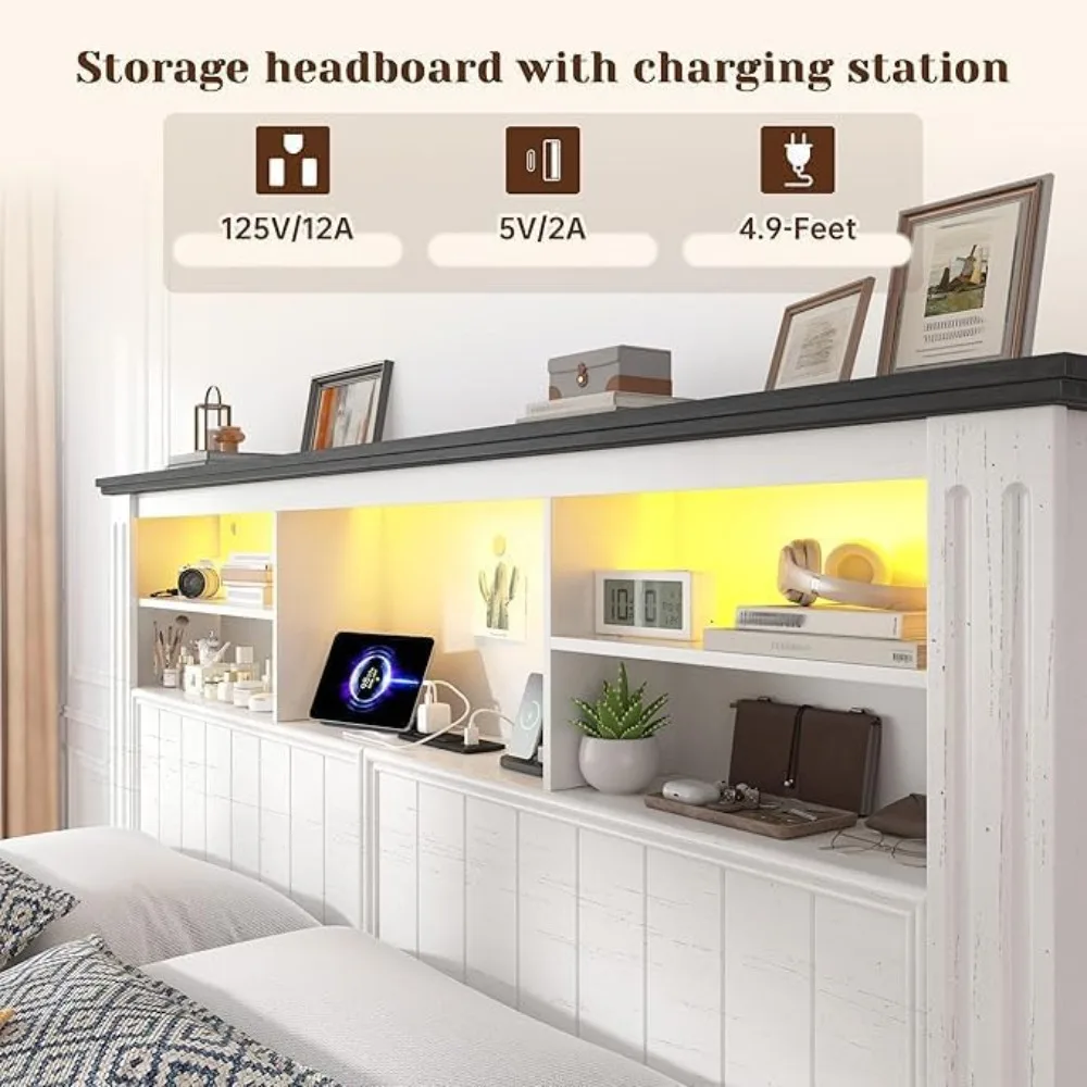 This queen size bed frame combines modern style with practical storage solutions. Four built-in drawers provide ample space for bedding, clothing, or accessories. The integrated LED lighting adds a soft and stylish glow to your bedroom. A built-in charging station keeps your devices powered and within reach. The headboard offers comfortable support for reading or relaxing in bed. Its sturdy platform design eliminates the need for a box spring. The clean and modern look complements a variety of bedroom decor styles. Designed for durability, it supports long-term daily use. The storage drawers help keep your bedroom organized and clutter-free. Upgrade your sleeping space with this functional and stylish queen bed frame.