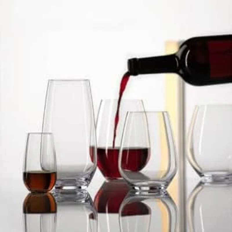 Set of 8 hand-blown stemless wine glasses, 18.5oz each. Clear crystal design ideal for red wine, cocktails, or everyday entertaining with elegance.