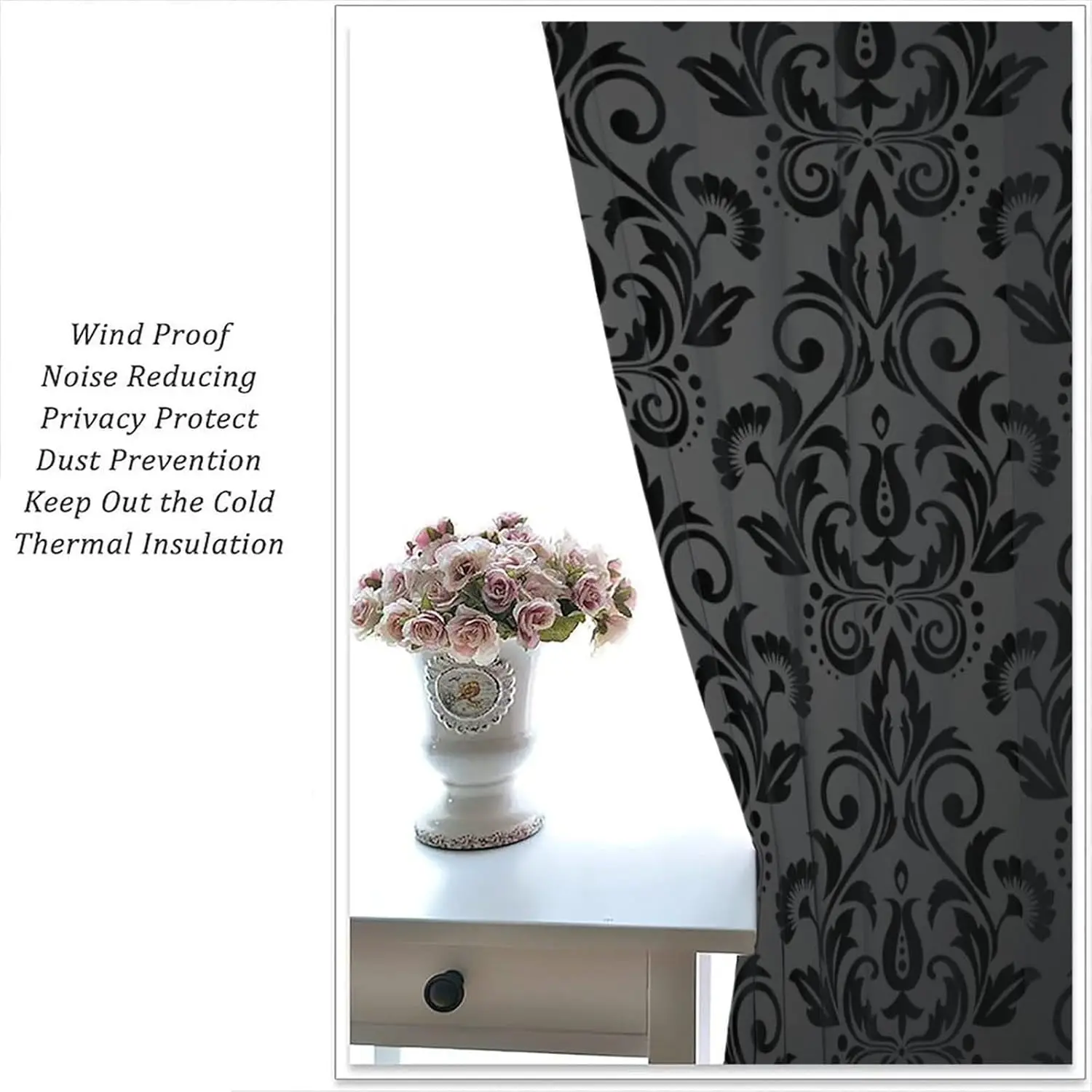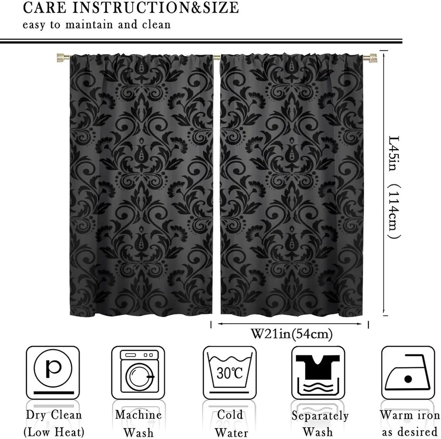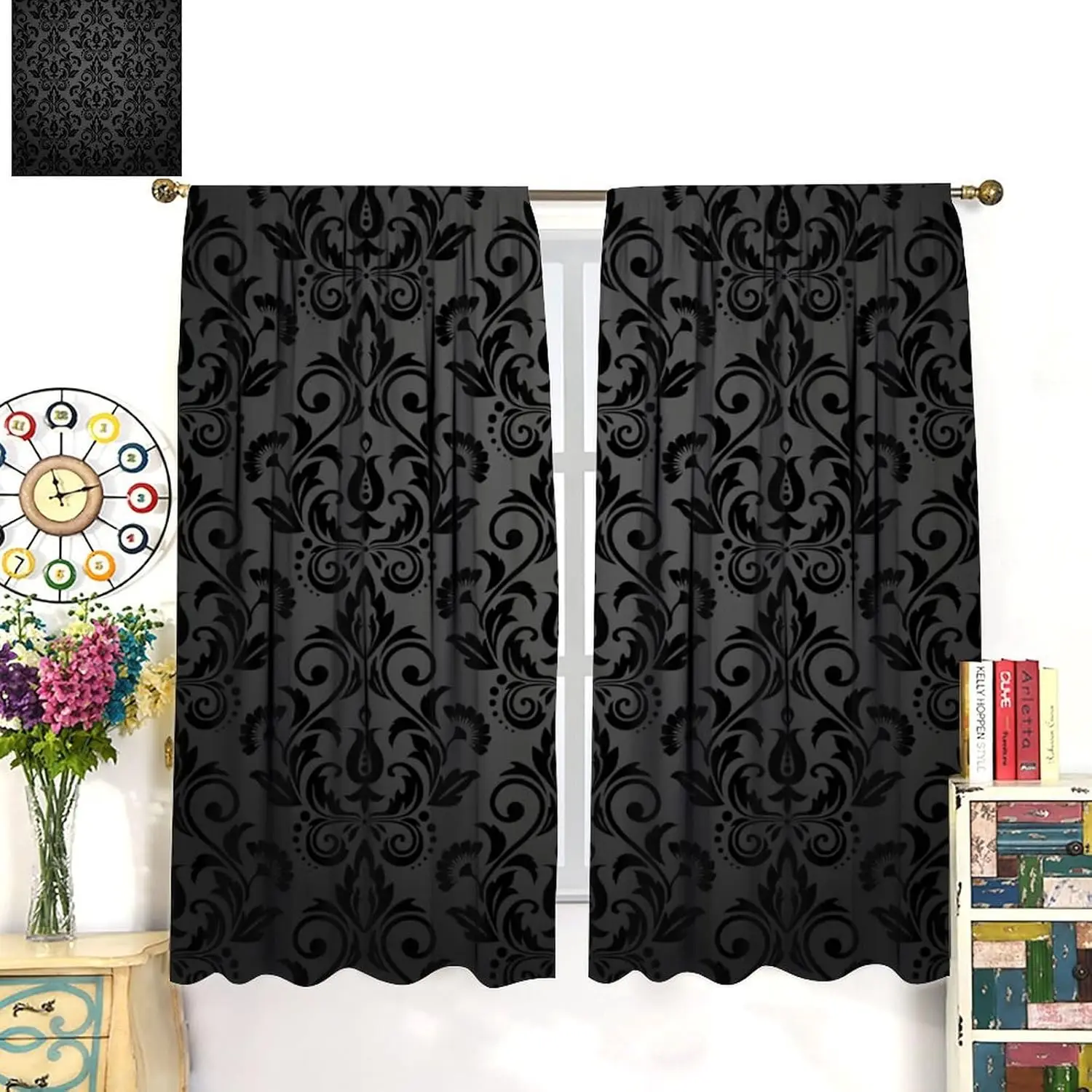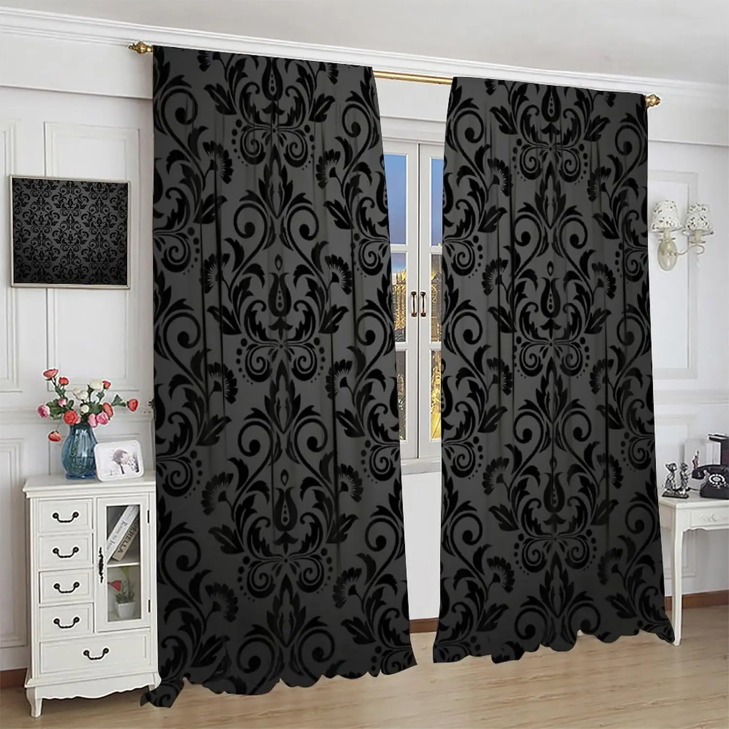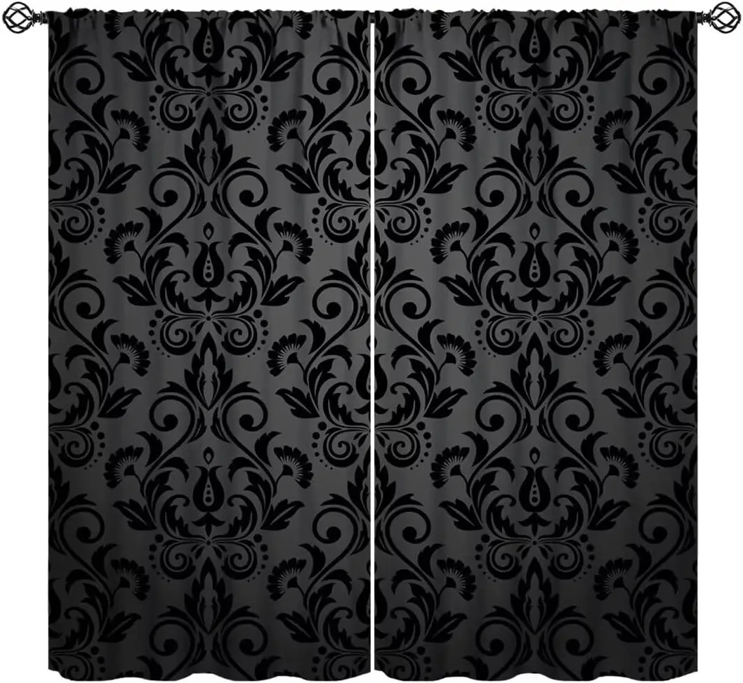 Transform your space with these black damask curtains, featuring an antique Victorian-style design that exudes gothic elegance and vintage charm. The luxurious black floral pattern adds depth and sophistication, making it a striking focal point for any room. Crafted with durable fabric and a classic rod pocket, these curtains hang smoothly while providing privacy and light control. Perfect for living rooms, bedrooms, or study areas, they complement both bohemian and exotic interior styles. Ideal for those who appreciate timeless, dramatic décor, these curtains combine aesthetic appeal with practical function, enhancing windows with rich texture, elegance, and a sense of refined luxury that elevates any home environment.